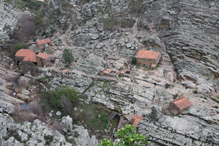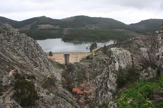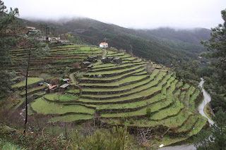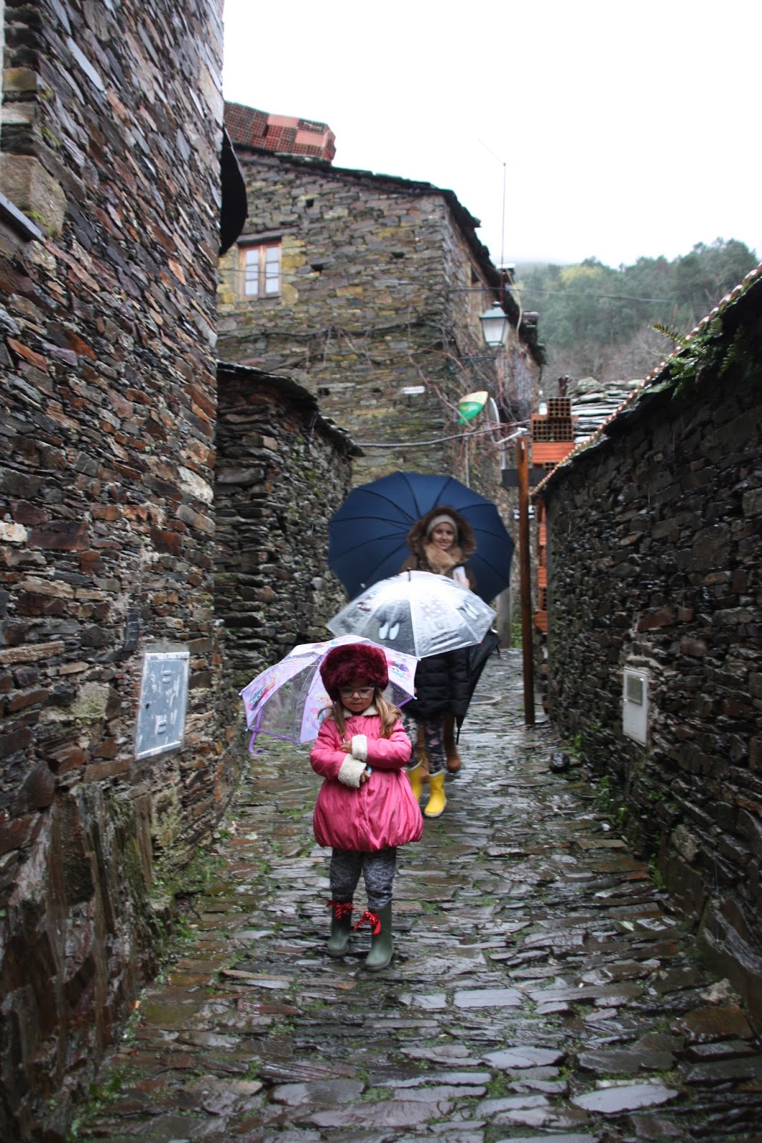 As condições meteorológicas pioram a olhos vistos e temos a maior viagem entre aldeias para fazer: de Castelo Novo a Piódão. Siga que para a frente é o caminho! Não vou dizer que foi fácil. Não foi. Uma estrada cortada (não pelo mau tempo do dia, mas porque "abateu", disseram-nos num café, encolhendo os ombros. (Esperamos que não seja normal abaterem-se estradas por aí, pensamos nós). E dai resultam muitos mais quilómetros em estrada menos boa, Serra do Açor acima. Resumindo: muita chuva, muitíssimo vento, e muita reza minha para não virem carros de frente a cada curva. Muita concentração, alguma tensão, e muitas apitadelas ao entrar nas curvas, assim como a falta de paciência do pai para com os medos legítimos (digo eu, a própria!) da mãe. Olha Piódão lá em baixo, diz o pai. Mas eu só quero é ESTAR em Piódão!, penso eu! (parar, estacionar, o que seja sem movimento em veículo imenso para aquelas estradas com aquelas condições meteorológicas...). Não fotografas?!, pergunta ele, parando na estrada. Silêncio. Respiro. Passo-lhe a máquina para a mão e penso: está quase...